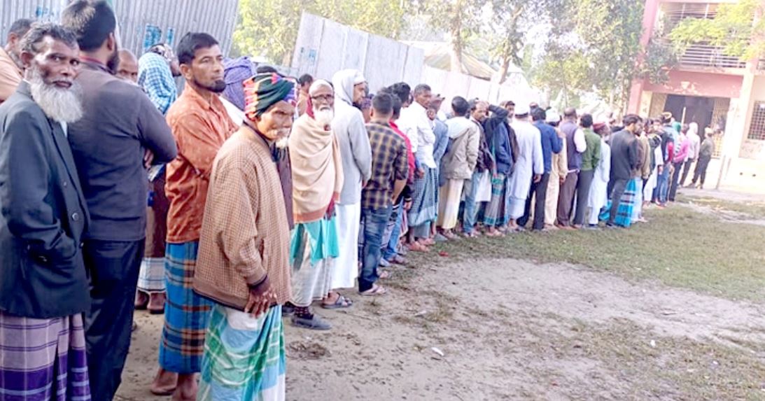 শীত উপেক্ষা করে কেন্দ্রে ভোটারদের দীর্ঘ লাইন