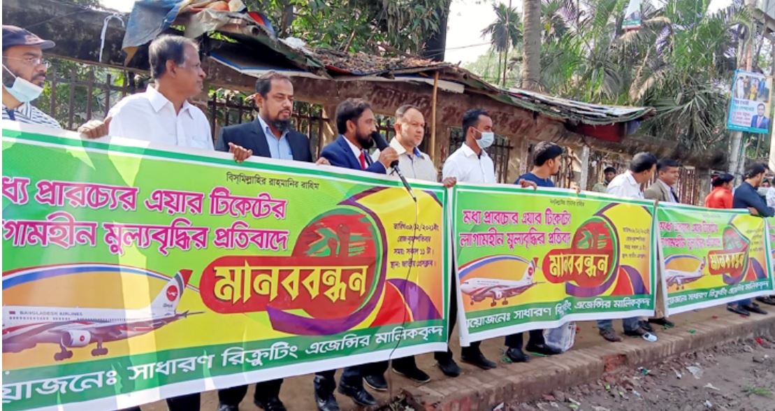 মধ্যপ্রাচ্যের প্লেনের টিকিটের মূল্যবৃদ্ধির প্রতিবাদে মানববন্ধন