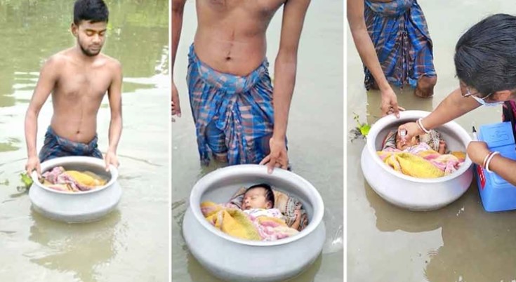 বানের পানি ঠেলে সন্তানকে নিয়ে পোলিও টিকাকেন্দ্রে বাবা!