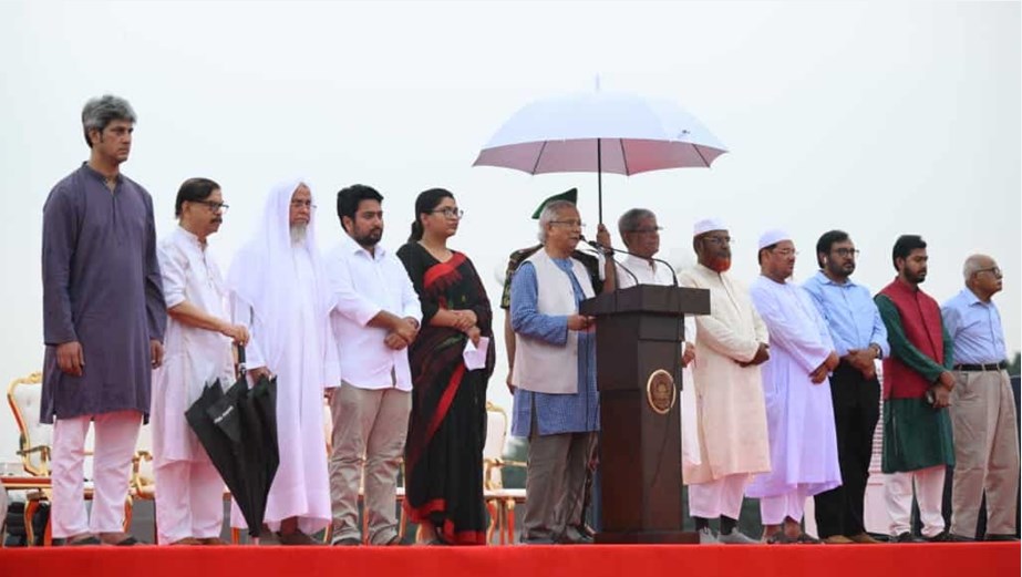 ঘোষণাপত্র পাঠ শেষে নেতাদের সঙ্গে বুক মেলালেন প্রধান উপদেষ্টা