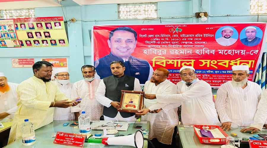 সিলেট জেলা পরিবহন শ্রমিক ইউনিয়নের পক্ষ থেকে এমপি হাবিবকে সংবর্ধনা