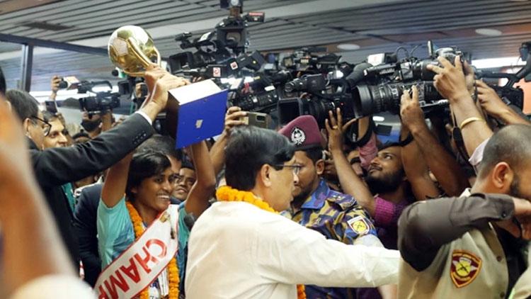 বিমানবন্দরে সাফজয়ী নারী ফুটবলারদের ফুলেল সংবর্ধনা