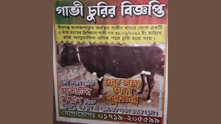 চুরি হওয়া গরুর সন্ধান দিলে লাখ টাকা পুরস্কার