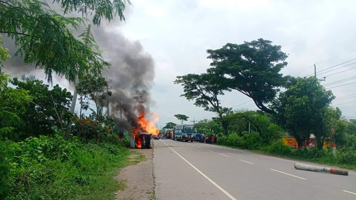 উল্টে গেল অটোরিকশা অতঃপর পুলিশের মাইক্রোবাসে আগুন