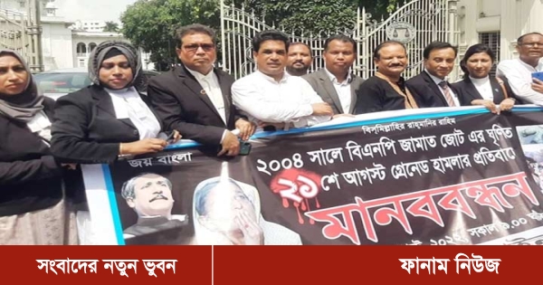 রক্তাক্ত বিভীষিকাময় ২১ আগস্ট গ্রেনেড হামলার ঘটনার প্রতিবাদে মানববন্ধন করেছে বঙ্গবন্ধু আওয়ামী আইনজীবী সমন্বয় পরিষদের আইনজীবীরা।