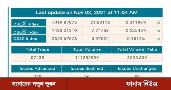 এ প্রতিবেদন লেখা পর্যন্ত বেলা ১১টা ৪ মিনিটে ডিএসইর প্রধান সূচক ডিএসইএক্স আগের তুলনায় ২১ পয়েন্টে বেড়েছে। তবে অপর দুই সূচকের মধ্যে ডিএসই-৩০ সূচক বেড়েছে ৩ পয়েন্ট। আর ডিএসই শরিয়াহ সূচক ৭ পয়েন্ট বেড়েছে।