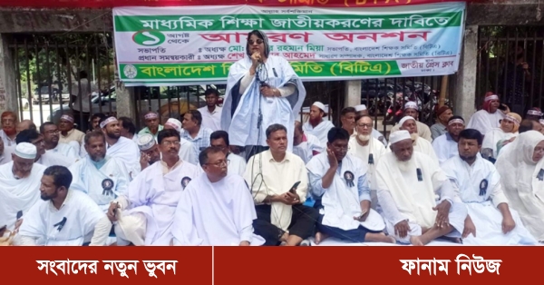 বেসরকারি মাধ্যমিক শিক্ষাপ্রতিষ্ঠান জাতীয়করণের দাবিতে গত ১১ জুলাই থেকে জাতীয় প্রেস ক্লাবের সামনে অবস্থান কর্মসূচি করেছেন শিক্ষকরা। আন্দোলনের ২১তম দিন সোমবার (৩১ জুলাই) তারা আমরণ অনশন করার ঘোষণা দেন। মঙ্গলবার (১ আগস্ট) শোকের মাসের শুরুর দিন থেকে কাফনের কাপড় পরে আমরণ অনশন শুরু করেন শিক্ষকরা।