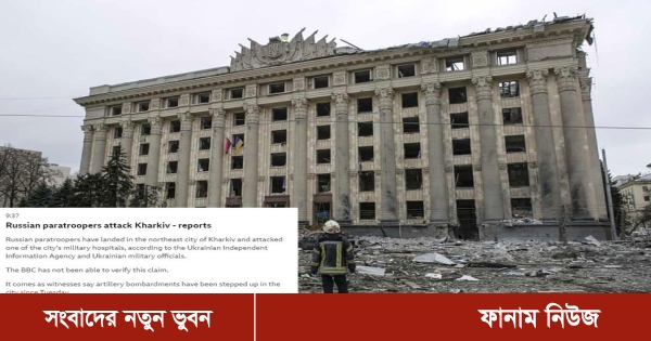 রাশিয়ার প্যারাট্রুপারার ইউক্রেনের উত্তর-পূর্বাঞ্চলীয় শহর খারকিভে অবতরণ করেছে এবং একটি সামরিক হাসপাতালে হামলা চালিয়েছে। আজ বুধবার ইউক্রেনের স্বাধীন তথ্য সংস্থা ও ইউক্রেনের সামরিক কর্মকর্তাদের বরাত দিয়ে এ খবর প্রকাশ করেছে বিবিসি।
