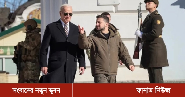 সোমবার (২০ ফেব্রুয়ারি) কিয়েভে বাইডেন ও ইউক্রেনের প্রেসিডেন্ট ভলোদিমির জেলেনস্কি রাশিয়ার সঙ্গে যুদ্ধে নিহত ইউক্রেনীয় সৈন্যদের স্মরণে তৈরি একটি স্মৃতিস্তম্ভ পরিদর্শন করেন। এরপর টেলিভিশনে যৌথ সংবাদ সম্মেলন করেন দুই নেতা।