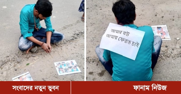 ভারতীয় সংবাদমাধ্যম জি নিউজের খবর, পিঠে ‘বউ ফেরত’ চাওয়ার কাগজ লাগিয়ে হাতে স্ত্রী-সন্তানের ছবি নিয়ে মঙ্গলবার দুপুরে আচমকাই শ্বশুরবাড়ির সামনে ধরনায় বসেন হরিদাস মণ্ডল নামে ওই যুবক। পেশায় রাজমিস্ত্রী সেই যুবক জানান, চার বছর আগে কাঠামবাড়ি এলাকার বাসিন্দা জ্যোৎস্না মণ্ডলের সঙ্গে বিয়ে হয় তার। সংসারে তাদের একটি মেয়ে রয়েছে, যার বয়স এখন দেড় বছর।