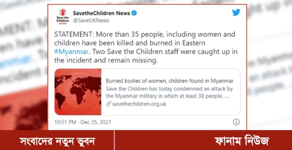 সেভ দ্য চিলড্রেন এক বিবৃতিতে জানিয়েছে, মিয়ানমারের পূর্বাঞ্চলের একটি রাজ্যে সহিংসতায় নারী-শিশুসহ নিহত হয়েছেন অন্তত ৩৫ জন। একই সময়ে তাদের দুইজন কর্মীকে ‘‘আটক’’ করা হয়েছিল। কিন্তু এখন তাদের খুঁজে পাওয়া যাচ্ছে না। তারা ‘‘নিশ্চিত হতে পেরেছে যে তাদের ব্যক্তিগত গাড়িতে হামলা করা হয়েছে এবং পুড়িয়ে দেওয়া হয়েছে”। এ ঘটনার পর বিভিন্ন এলাকায় তাদের কার্যক্রম স্থগিত করা হয়েছে।