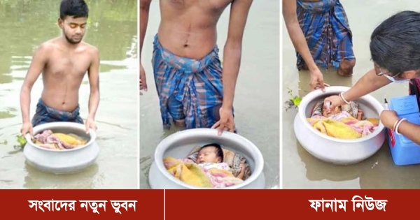 বাড়ির চারপাশ পানিতে তলিয়ে গেছে। এর মধ্যেই সন্তানকে পোলিও টিকা খাওয়ানোর খবর পান নিজামুদ্দিন মোল্লা নামের এক বাবা। তাই শিশুকে বড় পাতিলে করে পানিতে ভাসিয়ে পোলিও টিকা খাওয়াতে নিয়ে আসেন। এক স্বাস্থ্যকর্মী পানিতেই তার শিশুকে পোলিও টিকা খাওয়ান।