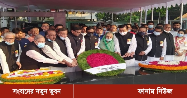 এদিকে সকাল সাড়ে ৭টার দিকে আওয়ামী লীগ সাধারণ সম্পাদক এবং সড়ক পরিবহন ও সেতুমন্ত্রী ওবায়দুল কাদের নেতৃবৃন্দকে সাথে নিয়ে দলের পক্ষে বঙ্গবন্ধুর প্রতিকৃতিতে পুষ্পস্তবক অর্পণ করেন।