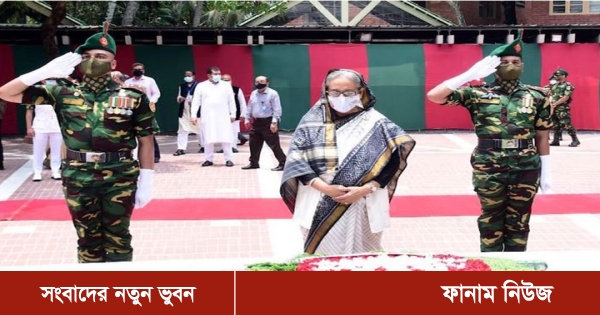 পুষ্পস্তবক অর্পণের পর তিনি স্বাধীনতার মহান স্থপতির স্মৃতির প্রতি গভীর শ্রদ্ধার নিদর্শন হিসেবে সেখানে কিছুক্ষণ নীরবে দাঁড়িয়ে থাকেন। যিনি ১৯৭৫ সালের ১৫ আগস্টের ভয়াবহ রাতে বিপথগামী কিছু সেনা সদস্যের গুলিতে তার পরিবারের অধিকাংশ সদস্যসহ নির্মমভাবে নিহত হন।