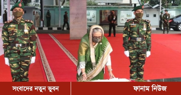 সোমবার (১৫ আগস্ট) ভোর সাড়ে ৬টায় ধানমন্ডির ৩২ নম্বরে বঙ্গবন্ধু ভবন প্রাঙ্গণে পুষ্পস্তবক অর্পণ করেন তিনি।