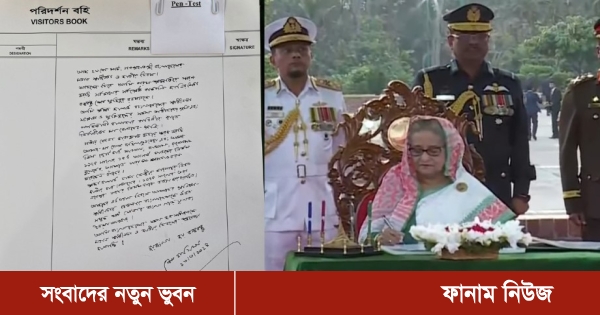 পরিদর্শন বইয়ে প্রধানমন্ত্রী লিখেছেন, আজ ২৬শে মার্চ, গণপ্রজাতন্ত্রী বাংলাদেশের মহান স্বাধীনতা ও জাতীয় দিবস। আজকের দিনে আমি পরম শ্রদ্ধাভরে স্মরণ করছি সর্বকালের সর্বশ্রেষ্ঠ বাঙালি ও জাতির পিতা বঙ্গবন্ধু শেখ মুজিবুর রহমানকে। আমি শ্রদ্ধা জানাই বাংলাদেশের স্বাধীনতার সংগ্রাম ও মুক্তিযুদ্ধের শহীদদের প্রতি এবং পাকিস্তানি হানাদার বাহিনীর হাতে নির্যাতিতা মা-বোনদের প্রতি। গভীর বেদনাভরা ক্লান্ত হৃদয়ে স্মরণ করছি আমার মা বেগম ফজিলাতুন নেছা এবং আমার তিন ছোট ভাই কামাল, জামাল, রাসেলসহ ১৯৭৫ সালের ১৫ই আগস্ট ঘাতকদের নির্মম বুলেটে আঘাতে যারা শাহাদাত বরণ করেছেন তাদের।