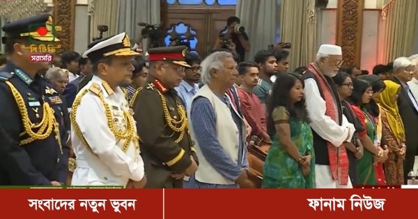 অন্তর্বর্তীকালীন সরকারের প্রধান উপদেষ্টা ও উপদেষ্টাদের শপথ অনুষ্ঠানে কোটা বিরোধী আন্দোলনে নিহত শহীদদের স্মরণে এক মিনিট নীরবতা পালন করা হয়েছে।