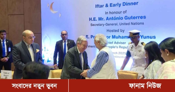 শনিবার (১৫ মার্চ) রাজধানীর হোটেল ইন্টারকন্টিনেন্টালে জাতিসংঘ মহাসচিবের সম্মানে ইফতার অনুষ্ঠান আয়োজন হয়। সেখানেই আন্তোনিও গুতেরেসকে এভাবে অভিবাদন জানান প্রধান উপদেষ্টা।