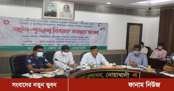 নোয়াখালী জেলা প্রশাসক মোহাম্মদ খোরশেদ আলম খানের সভাপতিত্বে অনুষ্ঠিত আইন শৃঙ্খলা ও সমন্বয় সভায় এ সময় আরো উপস্থিত ছিলেন নোয়াখালীর পুলিশ সুপার মোহাম্মদ শহীদুল ইসলাম, (পিপিএম), বিজিবি ফেনী ব্যাটেলিয়ানের কমান্ডিং অফিসার লেফট্যানেন্ট কর্নেল আবদুর রহিম, র্যাব ১১ সিপিসি-৩ লক্ষ্মীপুর ক্যাম্প ইনচার্জ জেলা নির্বাচন কর্মকর্তা রবিউল আলম কর্মকর্তাসহ নির্বাচনে সংশ্লিষ্ট সকল আইন-শৃঙ্খলা বাহিনীর কর্মকর্তারা।