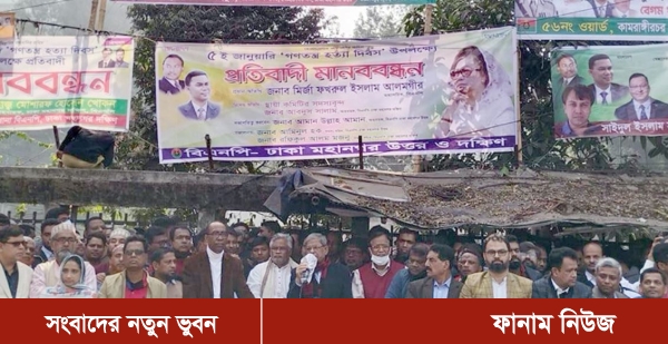 ঢাকা মহানগর উত্তর বিএনপির আহ্বায়ক আমান উল্লাহ আমানের সভাপতিত্বে এবং দক্ষিণের সদস্যসচিব রফিকুল আলম মজনু ও উত্তরের সদস্যসচিব আমিনুল হকের সঞ্চালনায় মানববন্ধনে দক্ষিণের আহ্বায়ক ও বিএনপি চেয়ারপারসনের উপদেষ্টা আবদুস সালাম, যুগ্ম মহাসচিব খায়রুল কবির খোকন, সাংগঠনিক সম্পাদক শামা ওবায়েদ, প্রশিক্ষণবিষয়ক সম্পাদক এবিএম মোশাররফ হোসেন, স্বেচ্ছাসেবকবিষয়ক সম্পাদক মীর সরাফত আলী সপু, তথ্যবিষয়ক সম্পাদক আজিজুল বারী হেলাল, নির্বাহী কমিটির সদস্য নাজিম উদ্দিন আলম, স্বেচ্ছাসেবক দলের সাধারণ সম্পাদক আব্দুল কাদির ভূঁইয়া জুয়েল, ছাত্রদলের সাধারণ সম্পাদক ইকবাল হোসেন শ্যামল প্রমুখ বক্তব্য রাখেন।