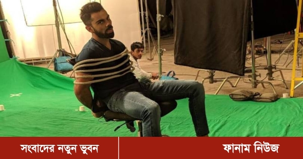 ছবিতে দেখা গেছে, একটি চেয়ারে বসে আছেন কোহলি। দড়ি দিয়ে তার হাত দুটো চেয়ারের পেছনে বাঁধা। খানিকটা জিভ বের করে ক্যামেরার দিকে তাকিয়ে তিনি। তার চোখে-মুখে ক্লান্তি। ভাবখানা এমন যে, নিজেকে বন্ধনমুক্ত করতে না পেরে হাল ছেড়ে দিয়েছেন।