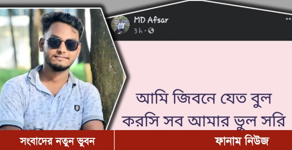 ‘আমি জিবনে যেত বুল করসি সব আমার ভুল সরি’ ফেসবুকে এমন স্ট্যাটাস দেওয়ার দুই ঘণ্টা পর মো. নুরুল আফসার (২০) নামে এক যুবকের ঝুলন্ত মরদেহ পাওয়া গেছে।